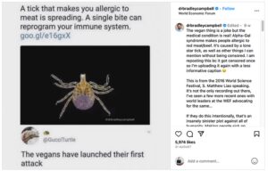- Vegetarianism or veganism are “unhealthy”, while meat eating is “healthy”, “natural” or “sustainable”. (This was primarily spread by ‘carnivore influencers’ such as @CarnivoreAurelius 722k followers).