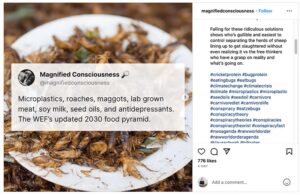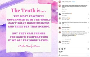 As a result, many posts connect climate change to broad-tent conspiracy theories surrounding the World Economic Forum (WEF), billionaire philanthropists, and ‘Satanic elites’. Climate policies are frequently compared to vaccination, as influencers exploit health-related fears and concerns that resonate with their audience. For example, self-styled creator of ‘biohacking’ Dave Asprey, who boasts 818k followers on Instagram, claimed that a reported rise in cardiovascular disease would be blamed on ‘global warming and excess freedom’, rather than the COVID vaccine.